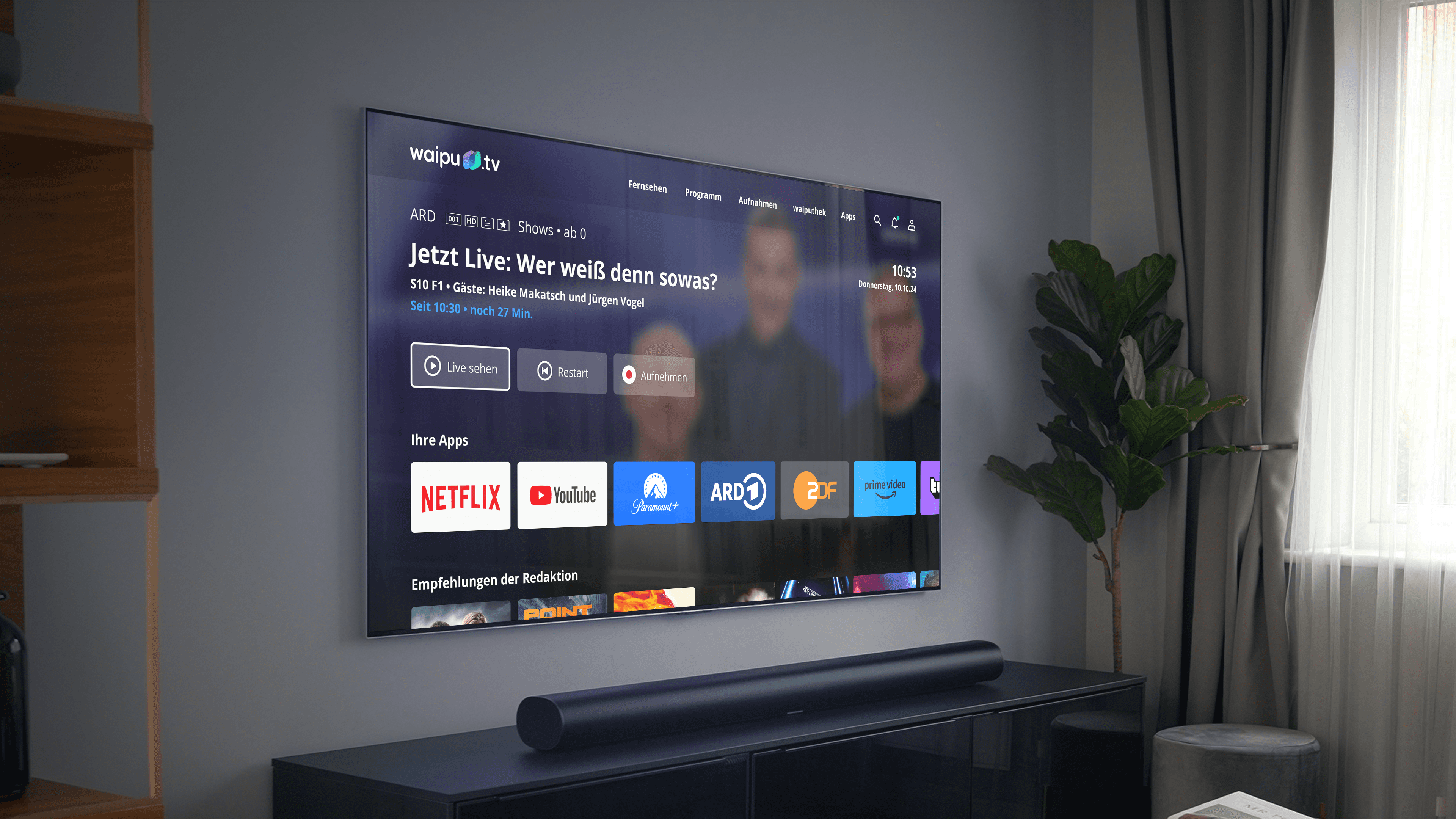 waipu.tv offers access to more than 300 TV channels, including public broadcasters, private channels, and over 70 pay-TV channels, making it Germany’s largest platform for HD television. In addition, users can explore the waiputhek, which features more than 40,000 movies and series on demand. The service supports simultaneous streaming across multiple devices and can be used both on TV sets and wirelessly via Wi-Fi on other screens.
